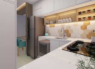 O nosso grande desafio foi fazer uma cozinha que atendesse todas as necessidades da cliente, em um ambiente bem pequeno, porém, conseguimos deixar uma cozinha bem linear e com bastante área de armazenamento, que era a principal necessidade da cliente.