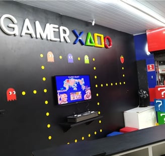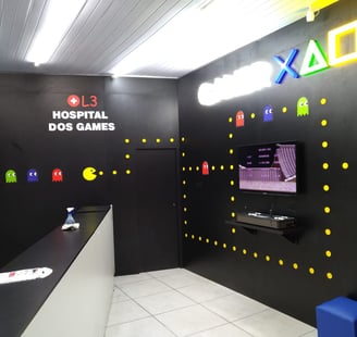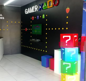 Utilizamos peças grandes de lego, para compor a vitrine, trouxemos peças de jogos, adesivos tudo para trazer uma identidade única a loja de games e assim ressignificar o espaço. Reaproveitamos todos os móveis existentes da antiga loja do cliente, fizemos alguns acréscimos, resultando em maior satisfação.